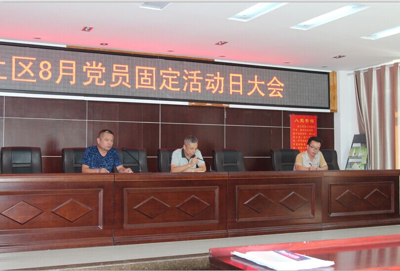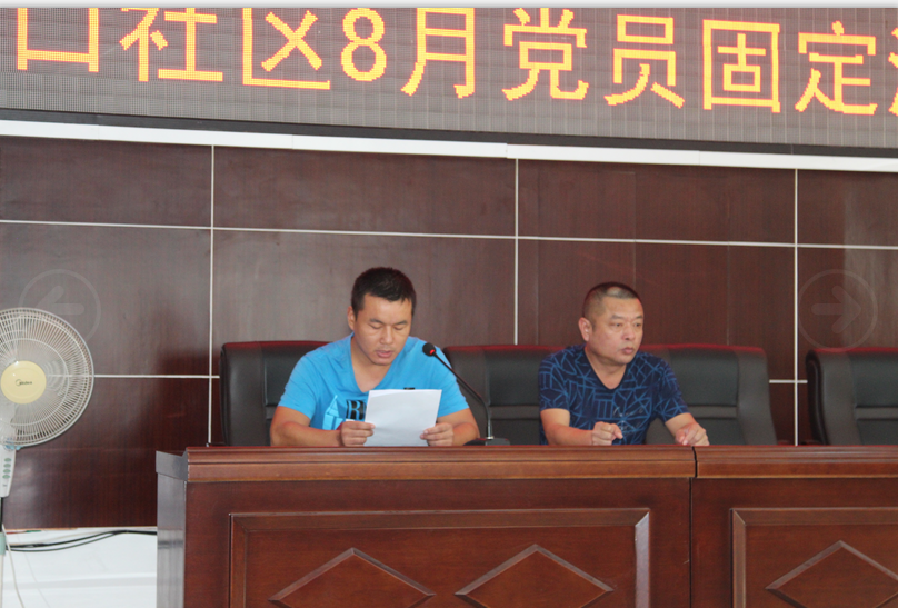 一、重温入党誓词(佩戴党徽,柳咏飞领读) 二、诵读《党章》总则18-21段和党的基层组织(魏艳菊诵读) 三、学习市政府文件(由万军诵读) 四、由李建军同志谈“两学一做”学习教育体会 五、由黄德才同志谈“两学一做”学习教育体会 六、由机关干部涂主任就学习习近平总书记的“七一”重要讲话谈感受,上党课 七、由朱书记通报党支部8月份工作,安排9月份工作,重点“向污染宣战”,传达市、办两级会议精神,安排辖区的污染环境整治工作 八、按标准缴纳本月党费