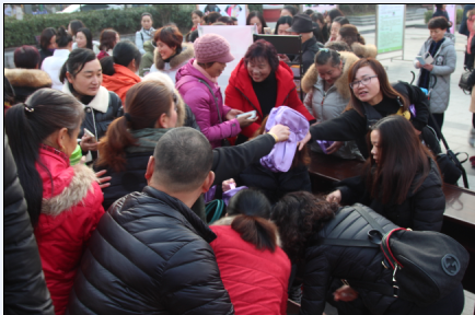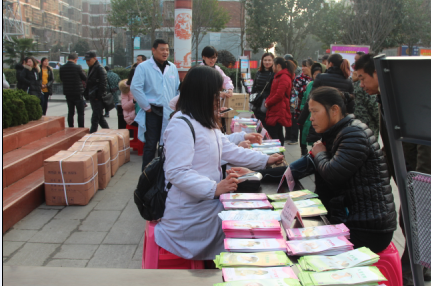2016年12月22日,流动人口健康教育行动促进会现场在刘口社区举行,市卫计委组织市计生服务站工作人员在社区广场为居民进行义诊,并发放避孕套、叶酸等物资。