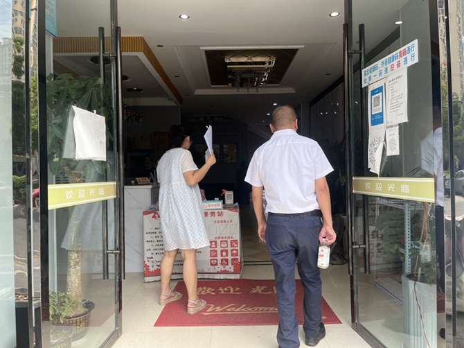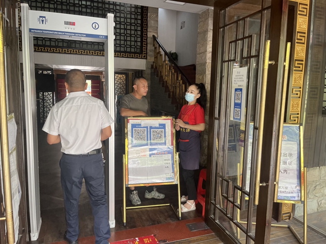 2022年9月8日,刘口社区对辖区内餐饮酒店、宾馆等重点场所进行一次督办,要求各场所各行业按常态化疫情防控要求安排专人查验2码、测温,查验五天一检的核酸报告,确保各场所自己的工作人员有五天内的核酸检测报告。