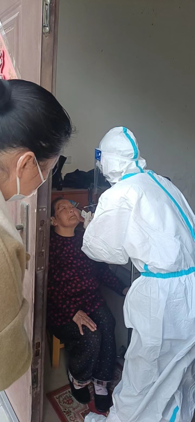 2022年10月12日,刘口社区带领医务人员前往行动不便的老人家中为他们做核酸。