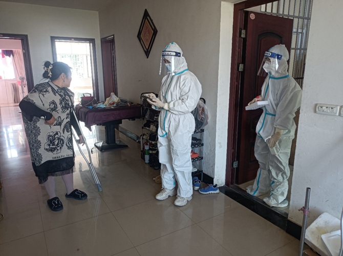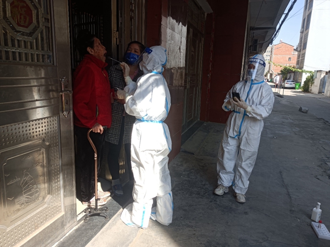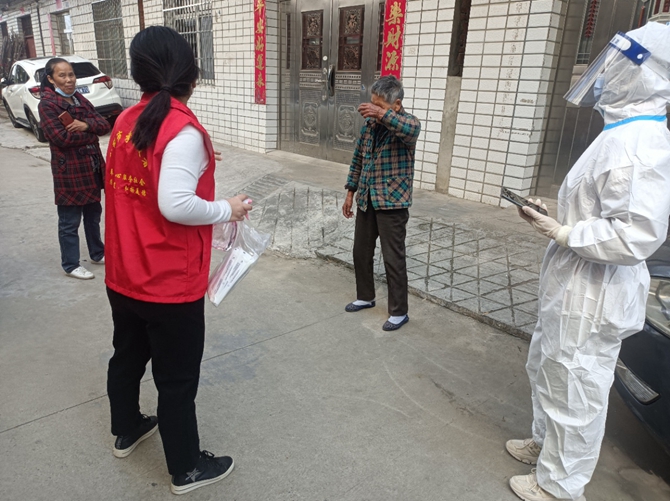 刘口社区带领医务人员前往行动不便的老人家中为他们做核酸。