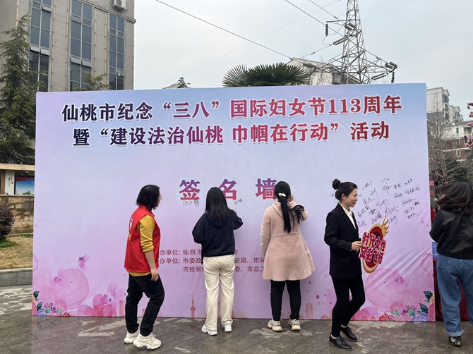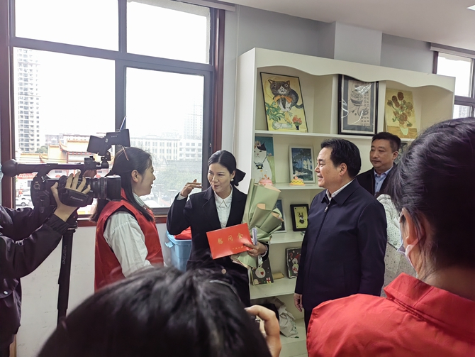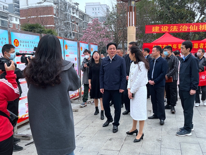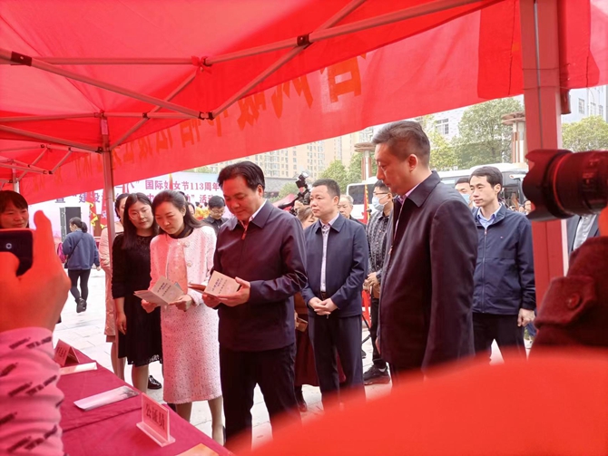 2023年3月7日上午,市委书记罗联峰、组织部长徐国亮、沙嘴办事处党工委书记柳华兵、沙嘴办事处党工委主任吴赤军等一行莅临刘口社区,观看“建设法治仙桃 巾帼在行动”活动现场,为2023年湖北省三八红旗手兰华授奖,并与优秀妇女代表座谈。