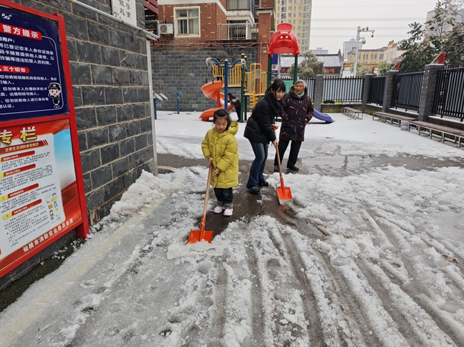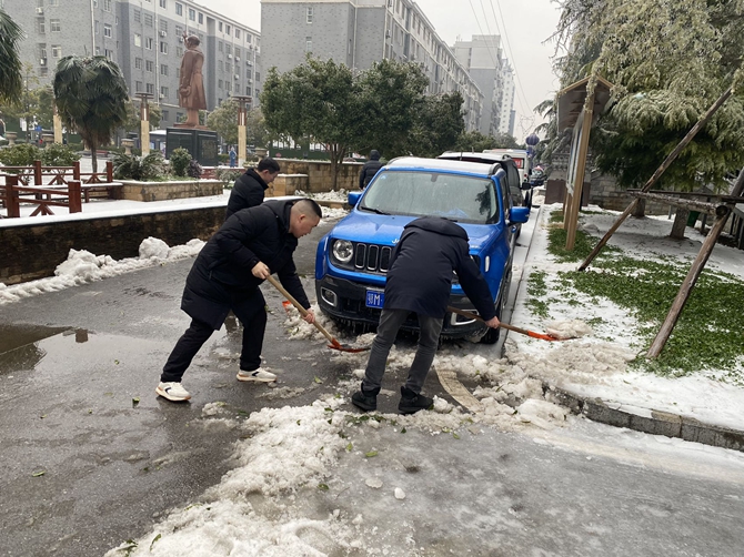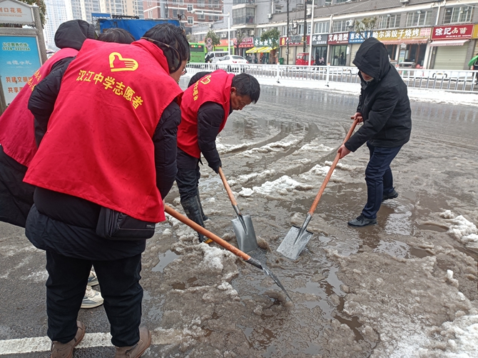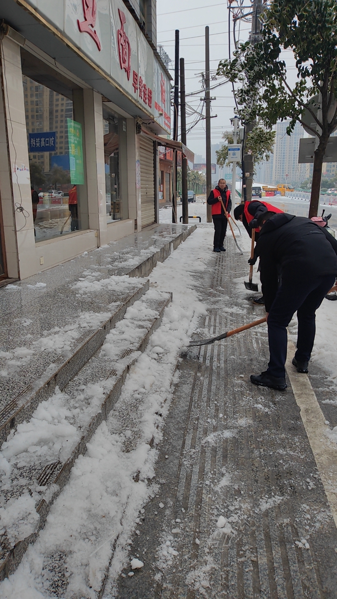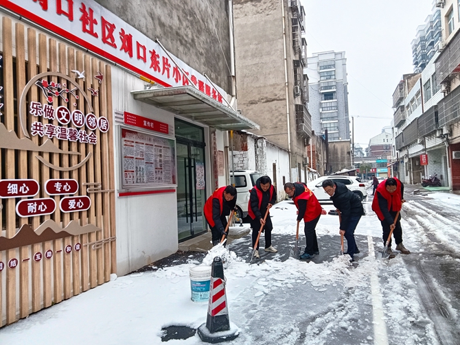 2024年2月3日下午,刘口社区包联单位市人社局和汉江高中积极响应号召,到社区开展"除雪破冰保安全"志愿服务活动,两个单位志愿者们大力挥舞铁锹,铲除积雪,为居民保安全。