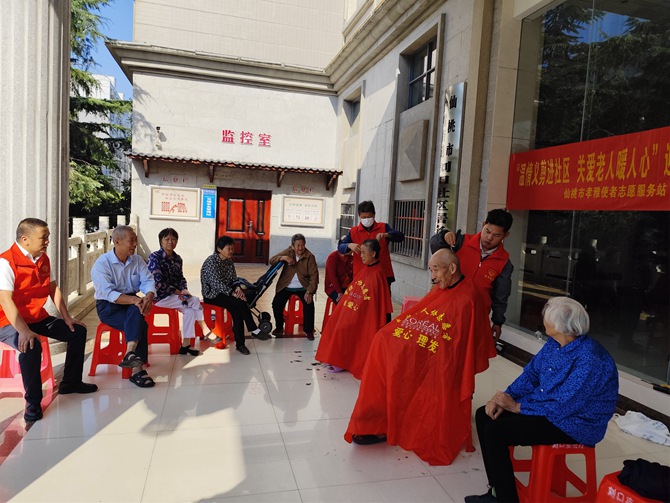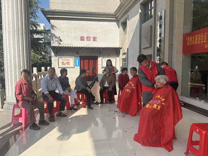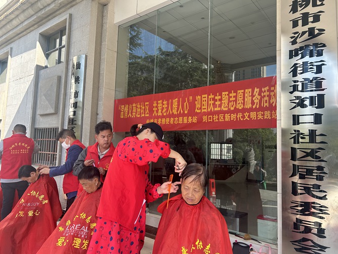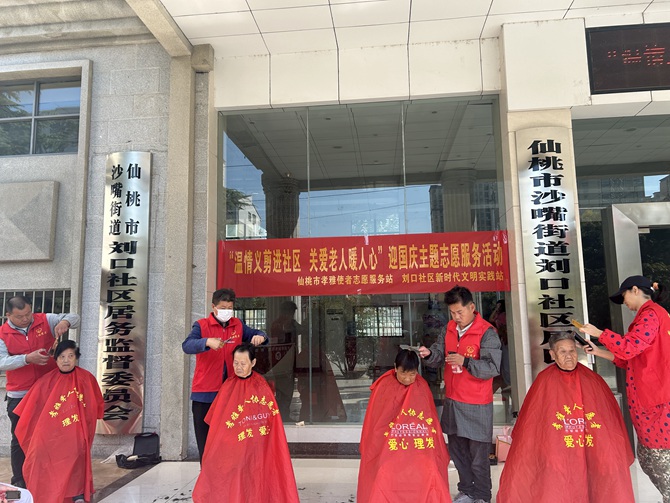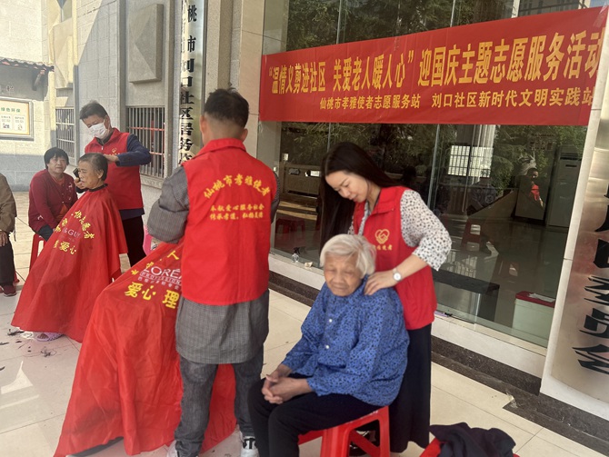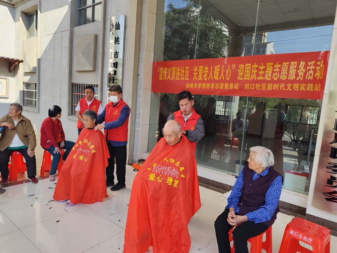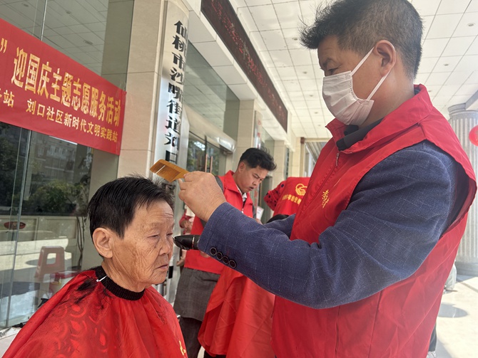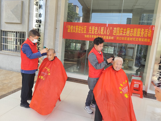 刘口社区联合仙桃市孝雅使者志愿服务站开展“温情义剪进社区 关爱老人暖人心”迎国庆主题志愿服务活动
