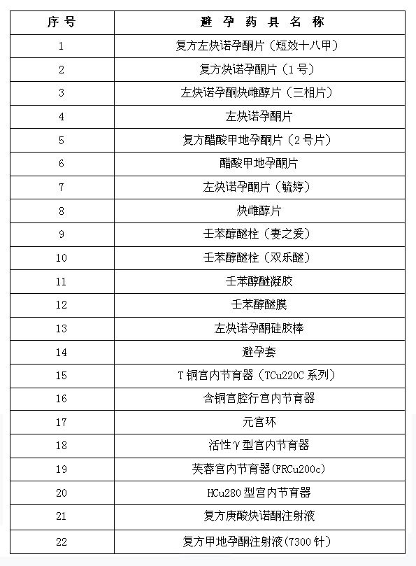 国家免费发放避孕药具目录