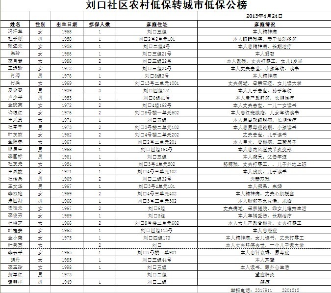 刘口社区农村低保转城市低保公榜