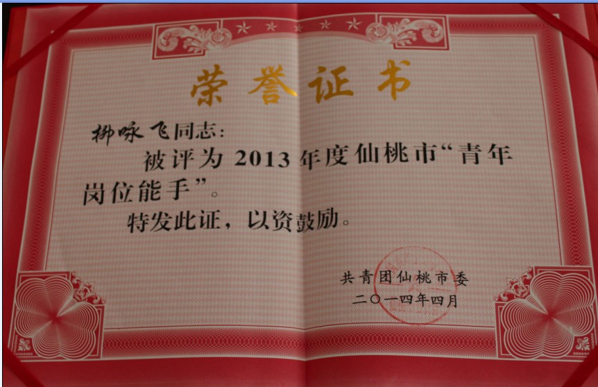 热烈祝贺柳咏飞同志被评为仙桃市“青年岗位能手”称号