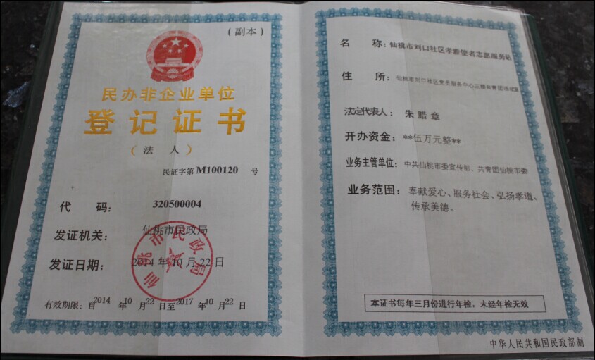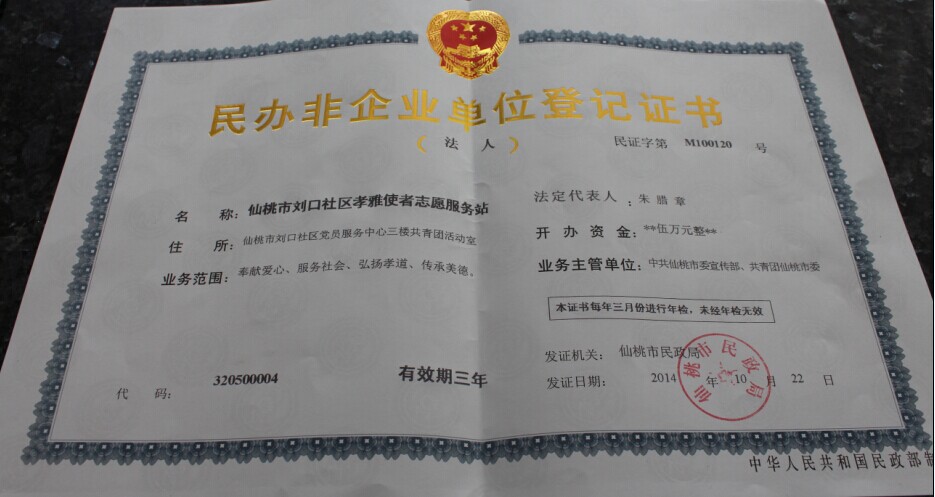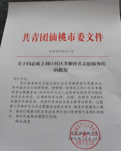 刘口社区孝雅使者志愿服务站于2014年9月22日在市委宣传部、共青团仙桃市委的关怀下申请注册成立,目前是我市唯一一家以社区命名注册的志愿服务站,注册人数71人,在此诚挚邀请社会各界爱心人士积极参与和加入我社区志愿服务队伍中来。
