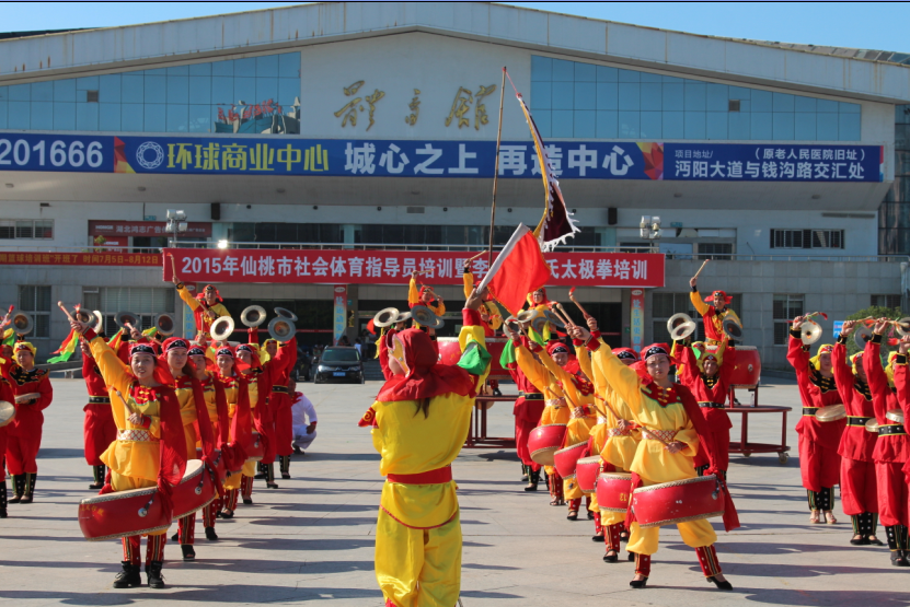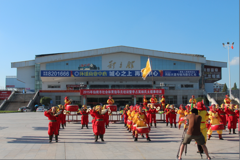 2015年7月30日,刘口女子威风锣鼓队在市体育广场为仙桃市对外宣传专题片进行表演,省电视台现场摄影。