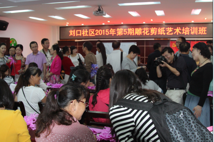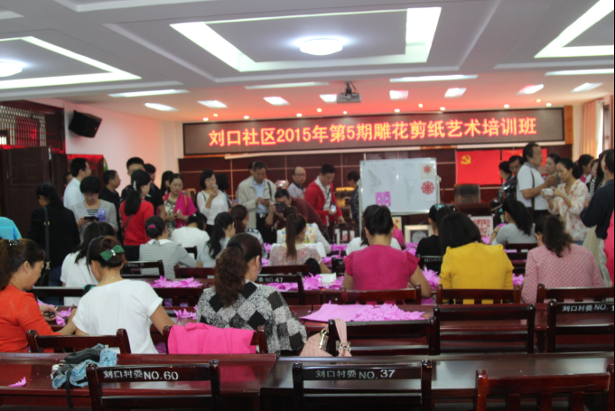 2015年9月18日,国家文化部组织全国各地剪纸艺术专家及爱好者参观刘口社区剪纸培训现场,并现场指导学员创作作品。