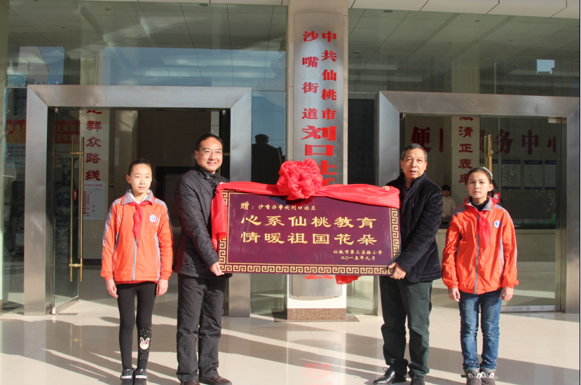12月16日,市实验三小校长游传桂率学校部分师生一行10多人,向社区赠送“心系仙桃教育 情暖祖国花朵”牌匾,感谢自开学已来对教育事业的关怀及资助。