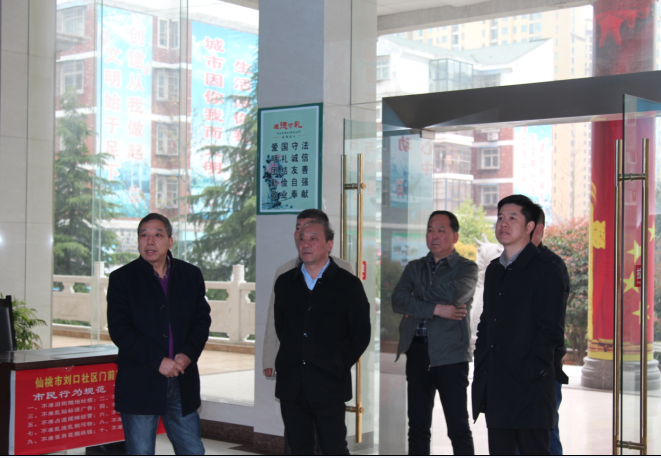 3月16日下午,天门市高新园党工委员伍云翔一行,在沙嘴街道办事处党工委书记丁斌武陪同下莅临我社区参观考察。