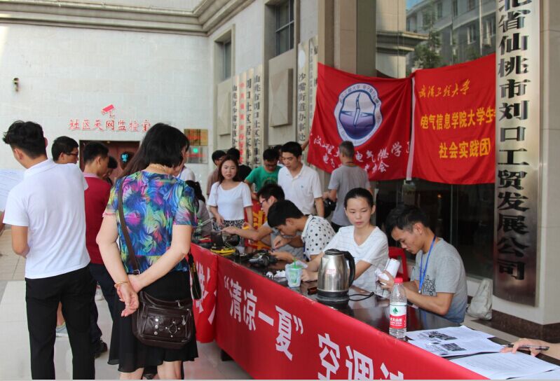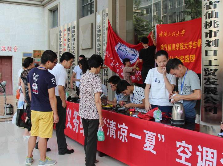感谢共青团仙桃市委、武汉工程大学电气信息学院“美丽中国行 电气维修”、理学院“清凉一夏 空调清洗”暑期社会实践团,以奉献爱心、服务社会为宗旨,暑期社会实践团为我小区居民进行电器义务维修、空调义务清洗等公益活动!